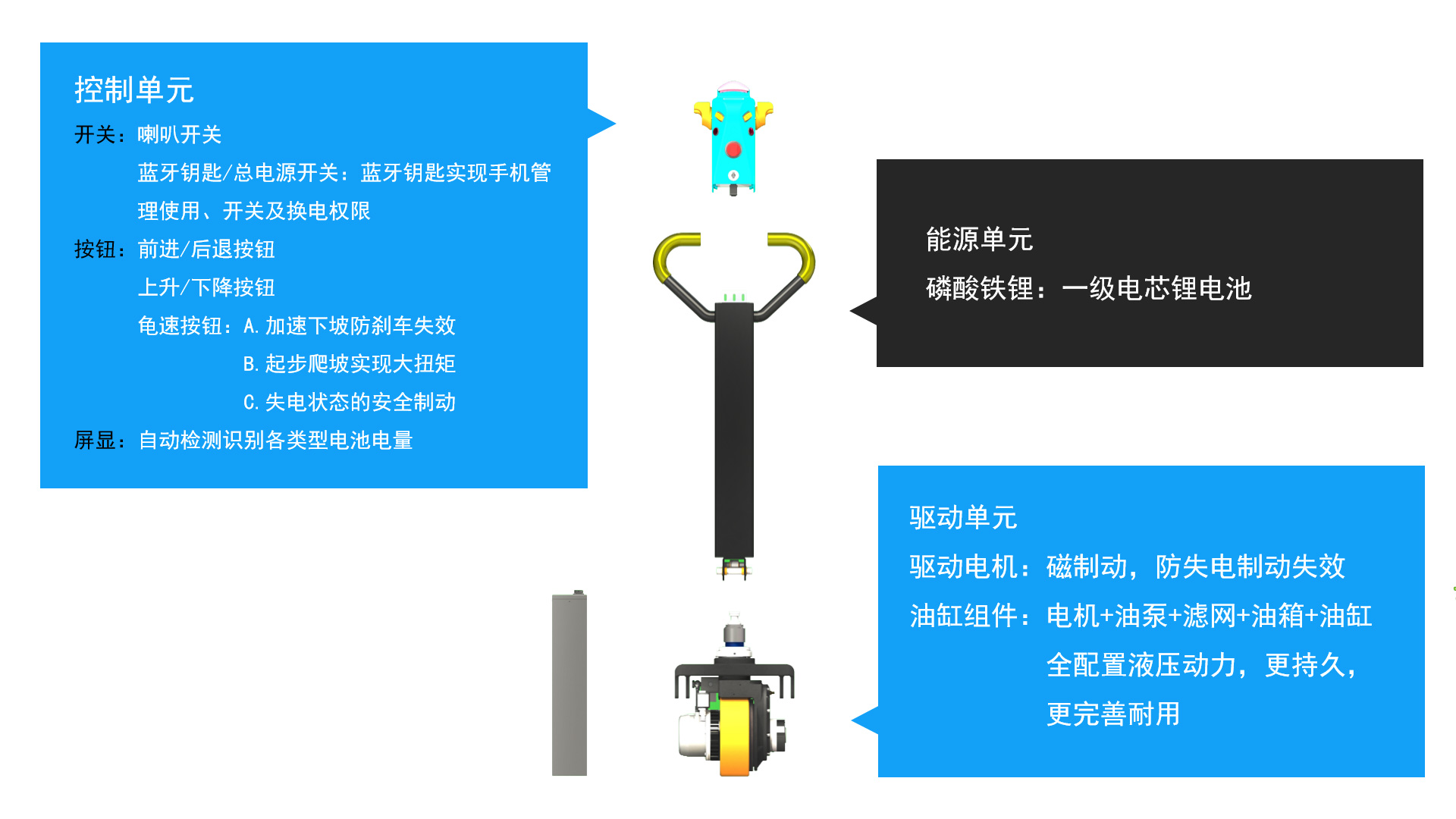 · 杆体空间可容纳48V10Ah~48V20Ah锂电池,可拆卸可更换,便于互换、共享换电模式。· 动力单元配置可更换(电机650W~1200W,可完美适配覆盖1T,1.5T,2T,2.5T的叉车载重需求。· 硬件尺寸标准统统一一致,便于配置互换自由组合。· 不同容量的电池可以与不同功率的动力单元自由组合,完美适配客户对于续航、载重的不同要求。