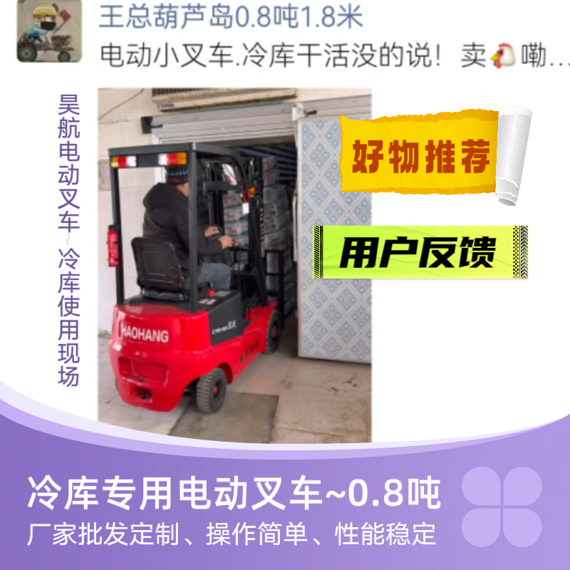 昊航冷库新能源电动叉车:0.5吨、0.8吨、1吨,适用于仓储、冷库专用、食品厂、海鲜、水果、蔬菜多楼层等狭小空间作业。
