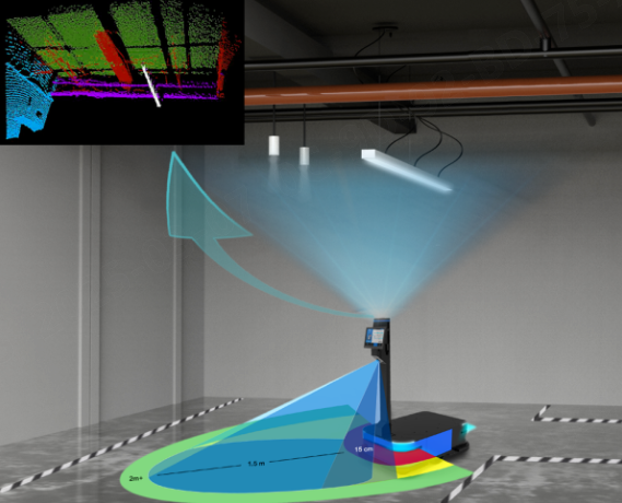 迈尔微视的顶视导航解决方案基于3D视觉相机,将其安装在移动机器人顶部,通过捕捉墙壁和天花板的自然特征进行定位。该系统无需在地面或墙壁上张贴标记,避免了地面环境变化对定位稳定性的影响。结合自主开发的导航算法,系统能够在动态和复杂的工业环境中提供精准的定位和导航服务。