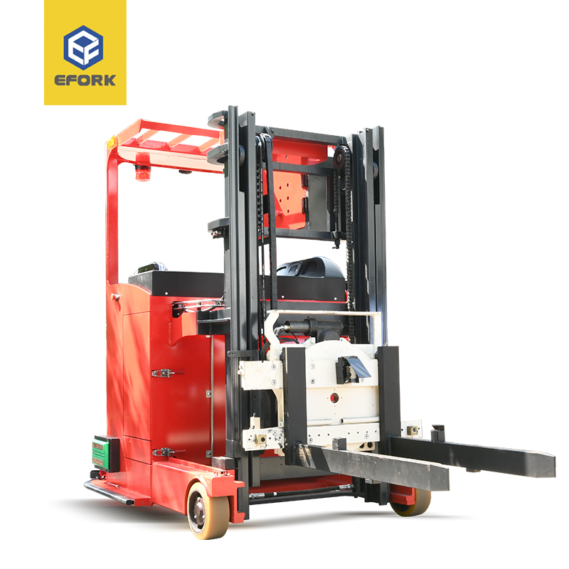 前移式叉车AGV的门架或者货叉架可以前后移动伸出到前轮之外叉取或放下货物,行走时货叉带货物收回,使货物重心在支撑面内;EFORK前移AGV有两条前伸的支腿,可以起到稳定作用。具有高举升,大载重,小体积等特点。