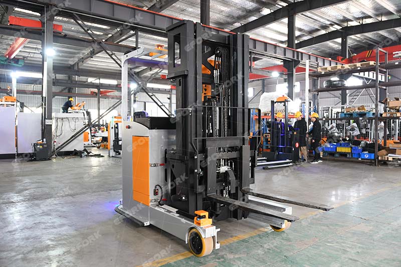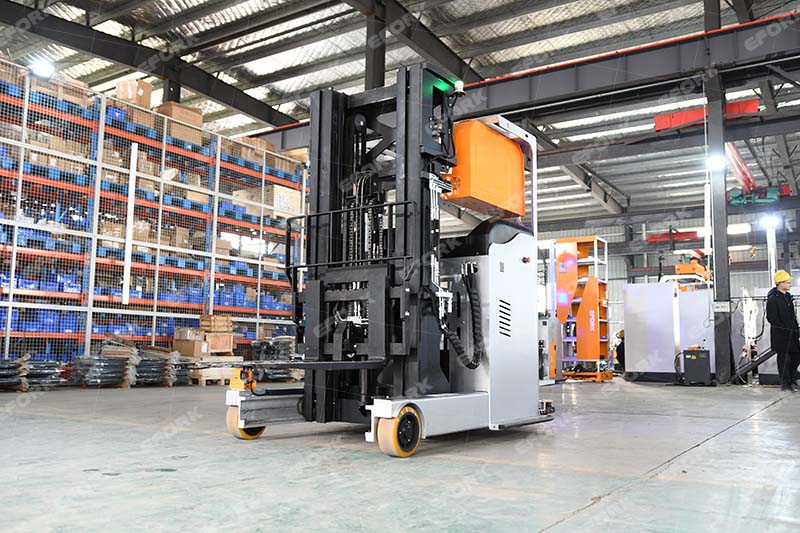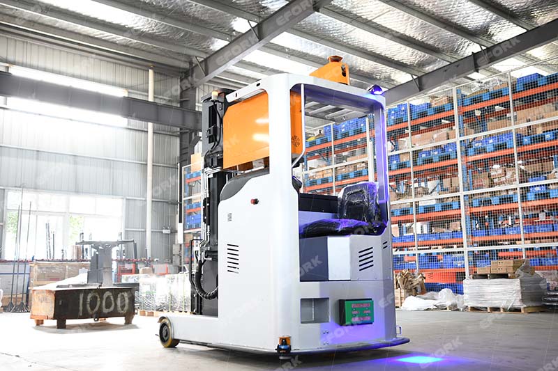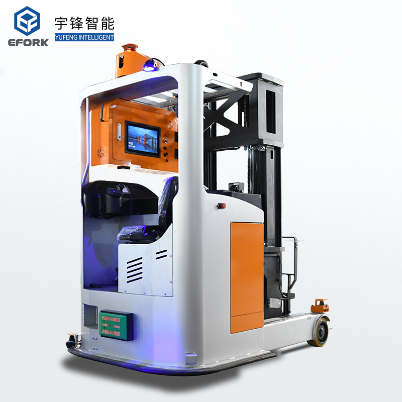 宇锋智能前移式叉车AGV的门架或者货叉架可以前后移动伸出到前轮之外叉取或放下货物,行走时货叉带货物收回,使货物重心在支撑面内;前移式叉车有两条前伸的支腿,可以起到稳定作用。