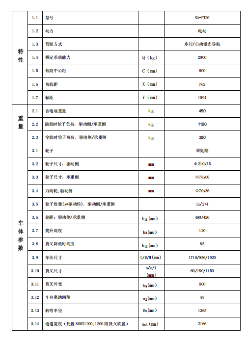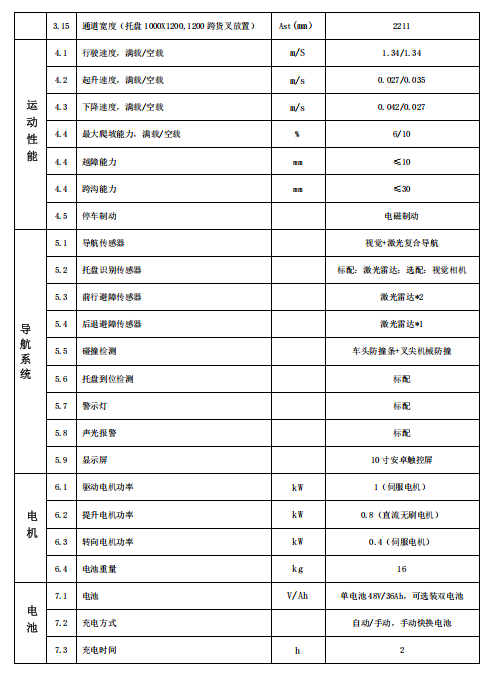 产品优势: --自主寻货:基于高精度视觉算法,托盘摆放不规整,无序情况下,智能定位托盘,调 整进叉方向。 --自动搬运:基于环境自然特征建图和定位,无需轨道和地标,可自主定位,规划路径, 行驶。 --安全可靠:3D 视觉,激光雷达,双急停按钮,碰撞条等多级安全措施,实现 360°全 向区域立体化安全防护。 应用行业: --适用于电商仓储,工厂产线到仓库的转运, --高频上下料,对接精度高, --多班制,全天 24 小时运行 选配: -- 多楼层电梯控制。 -- 对接 MES 调度系统多车联动。 -- 自动无线充电装置,低电量自行充电或按照指定时间完成自主充电。 -- 大容量,双电池不间断使用。