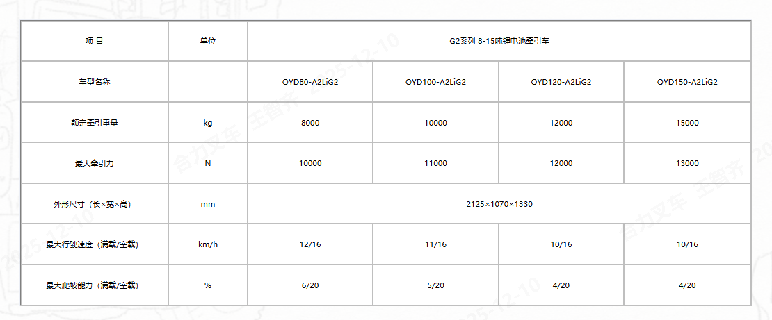 G2系列8-15吨锂电池牵引车是我公司新近开发的新能源环保型牵引车辆,具有低噪音无污染、奉引力大、操作简便、造型新颖、转向轻便灵活、操作舒适安全、性能稳定可靠、维护保养方便等优点,是国防、铁道、邮政、制造业、医药、烟草、物流等系统内牵引货物用的理想车辆。该系列牵引车系四轮支承,前轮转向、后轮驱动,以锂电池组提供动力,采用进口交流电控装置进行无级调速的电动牵引车。
