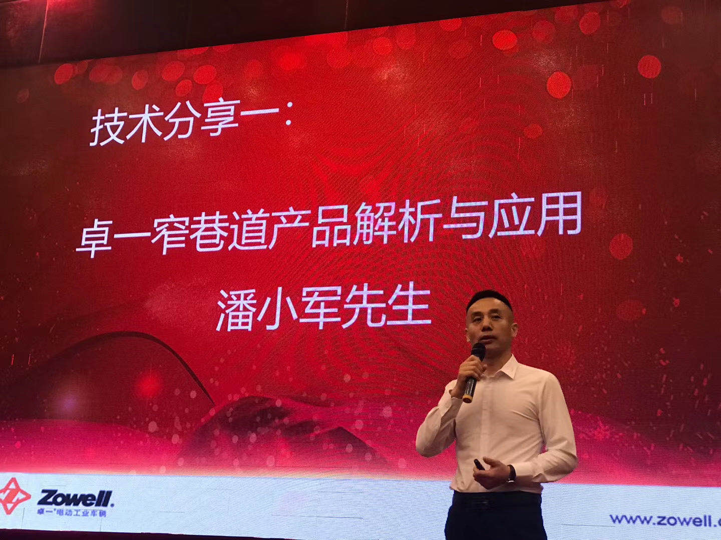 会上,卓一叉车总经理潘小军先生详细介绍了各款产品,介绍了窄通道叉车、全向叉车及双深位叉车的技术特点、应用场景及预期效益等内容,赢得了全场客户的高度认可和一致好评。