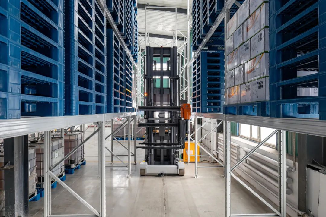 基于客户当前的存储需求和未来发展规划,我们为其设计了货到货间距仅1850mm的窄巷道高位货架搭配人下行三向AGV叉车的无人化窄巷道物流方案。货架高度9m,配合最大起升高度8.5m的三向AGV叉车,完全满足高起升大载荷的货物存取需求,为客户在新仓库开发出极大的库位量。