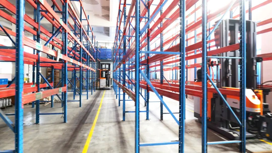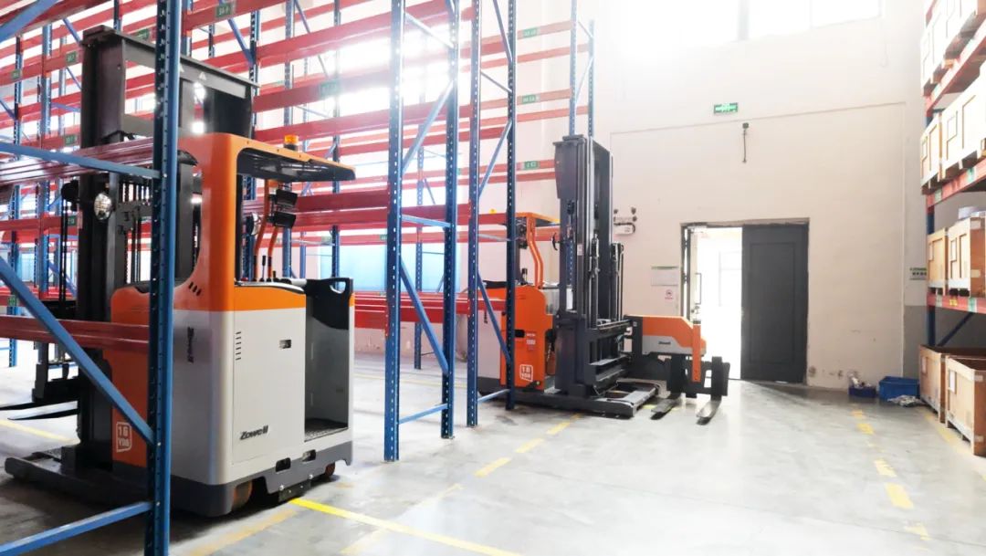 两台卓一人下行三向叉车,凭借独特的三向叉头,车身无需转向即可在狭窄巷道内对两侧货架实施存取作业,完美适配高密度货架布局,相比旧设备大大减少了通道浪费。