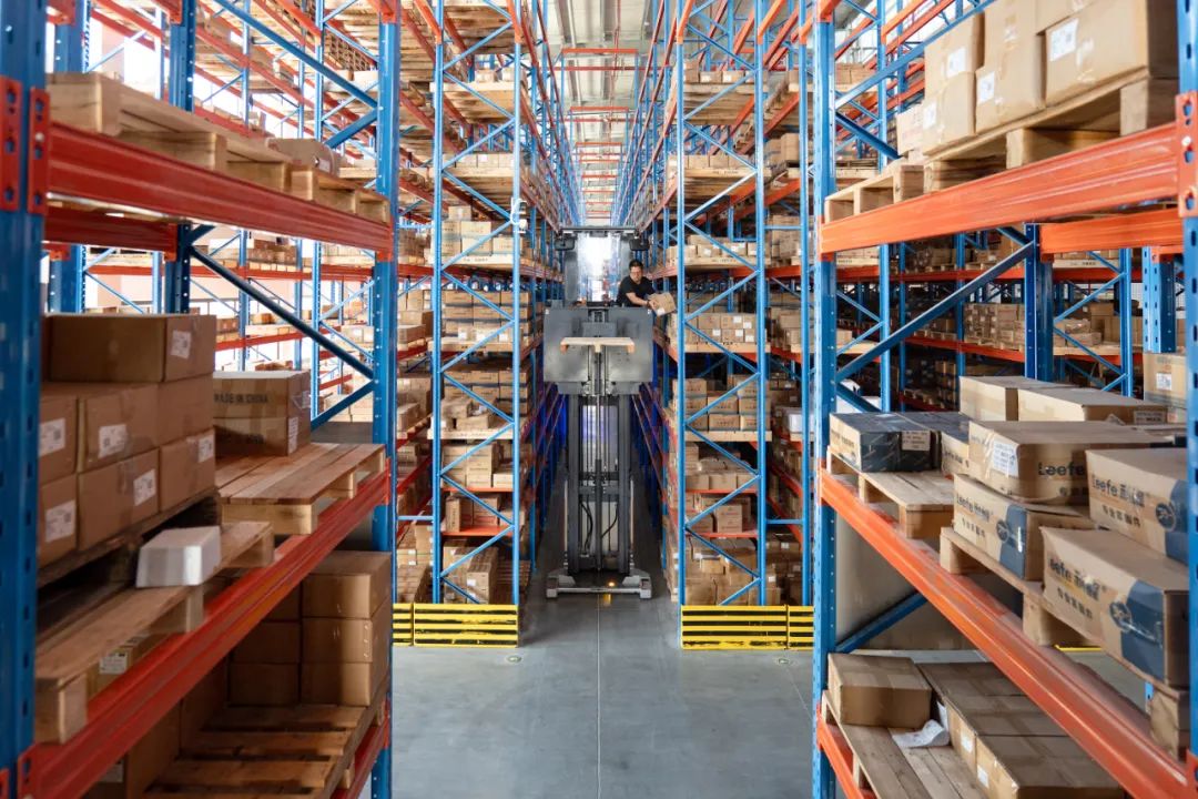 1.根据客户库高条件,卓一为客户提供了9.5m高窄巷道货架方案。现场共立有八排货架,以1.85m的巷道间距排列,巷道深度达76m,搭配9.5m的人上行三向叉车及8m的高位拣选叉车,以高位密集存储的形式为客户开拓了大量库位,库位利用率的提升也让5万多个SKU实现了系统化的科学管理,仓储难题迎刃而解。