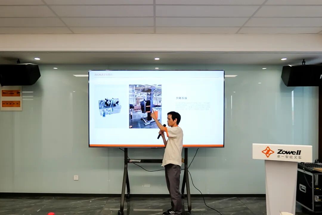 午休过后,卓一资深销售经理登台,聚焦讲解了卓一明星产品——RRE双伸位剪叉车。他着重阐述了“双伸位”剪刀叉设计的突出优势:在传统叉车无法企及的深度空间内,它能轻松实现双倍深度的货架存取作业,极大地提升了仓库空间利用率和物料周转效率。结合生动的应用场景视频,他将这款产品的高适应性、操作便捷性和为客户带来的实实在在的效益增长清晰地呈现在所有嘉宾面前。