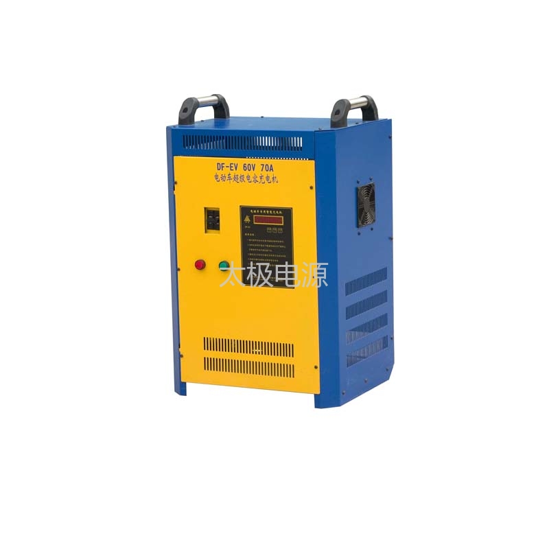 2)连接配套规格叉车蓄电池。 充电机检测到叉车蓄电池正确连接后,充电开始,程序进行约 8-10 秒的延时检测; 其间指示灯、数码管逐个呈流水闪烁,依次点亮; 如果叉车蓄电池已经正确连接,充电机自动启动充电,显示充电参数,指示充电工作状态, 直到充电机自动判断叉车蓄电池充足,充电机自动停止充电。 之后,只要叉车蓄电池与充电机依然连接,充电机定时对叉车蓄电池进行脉冲的维护充电,直到叉车蓄电池与充电机断开连接,等待下一次继续充电。 充电过程中,充电机根据叉车蓄电池电压数值,自动控制充电电流大小,无需人工对充电机 进行任何操作!