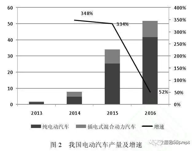 得益于国家密集出台的一系列鼓励政策,2015年我国电动汽车产销量呈现爆发式增长,成为汽车市场一大亮点。中国汽车工业协会数据显示,2016年我国电动汽车生产51.7万辆,比2015年同期增长51.7%,见图2。其中,纯电动汽车生产完成41.7万辆,比上年同期增长63.9%;插电式混合动力汽车生产完成9.9万辆,比2015年同期增长15.7%。