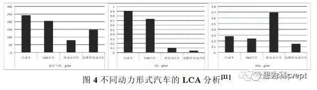 以天然气-CNG-CNG汽车、煤-火电-纯电动汽车、天然气-氢气-氢燃料电池汽车的“井口”到“车轮”(WTW)过程进行温室气体、CO和SOx排放的全生命周期分析(LCA)。如图4所示,在温室气体排放方面,纯电动汽车最小,氢燃料电池汽车次之,其后是CNG汽车,均优于汽油车;若氢气来自风电、光电(不稳定、难以并入电网,弃电率较高;而利用储能技术充放电存在效率损失)电解水制氢,则氢燃料电池汽车的温室气体排放要低于纯电动汽车。在CO和SOx减排方面,氢燃料电池汽车最具优势,纯电动汽车SOx排放最高。