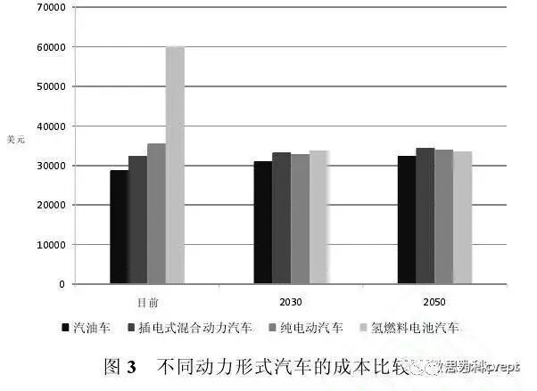 随着新能源汽车技术进步和产业配套的不断完善,未来纯电动汽车、尤其是氢燃料电池汽车生产成本存在极大的下降空间。国际能源机构(IEA)预测,到2050年纯电动汽车和氢燃料电池汽车生产成本将与汽油车基本相当,如图3所示。