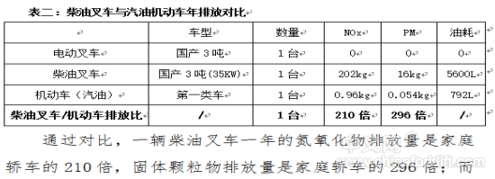 2016年10月关于《深圳市人民政府关于推广电动叉车的通告》及《电动叉车购置补贴资金管理办法》起草说明中对柴油叉车与汽油轿车排放做了对比数据: