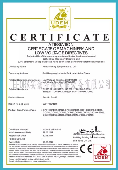 安徽宇锋电动叉车凭借其过硬的质量、优异的性能,通过一系列严格测试和检查,获得CE认证。此次获得CE认证证书,标志着安徽宇锋达到欧盟指令性要求,实现了与欧洲和国际标准的全面接轨,为加快公司开拓国际市场的步伐,为全面实施公司做大做强叉车产业的发展战略奠定了基础。