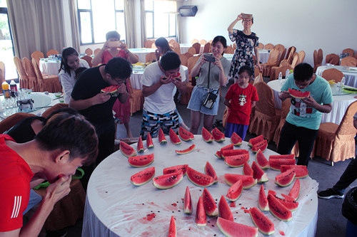 七月,透蓝的天空,悬着火球版的太阳,因天气炎热大家转场来到室内开展吃西瓜的清凉游戏,比赛现场,大家吃的风卷残云,酣畅淋漓,啃出了技巧,赛出了开怀,随后由市场部“花木兰”一战豪雄,脱颖而出,勇夺冠军,获得了去捉鸡场抱得老母鸡光荣回乡的机会!