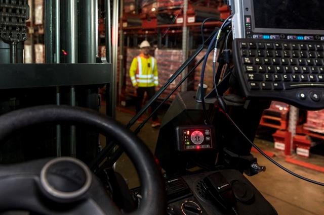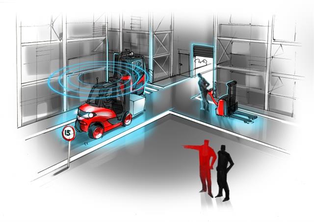 Teknect安全辅助系统旨在应对另一种危险情况:日常工业运营中经常出现的人车密切互动。这包括,例如,人们不小心穿过门进入驾驶员的路径,从而有发生碰撞的风险。在这些情况下,Teknect安全系统会及早警告人员和叉车司机彼此的存在。该概念基于使用超宽带技术的定位,并以高达10厘米的精度运行。它由一个卡车单元组成——一个永久安装在车辆上的紧凑型模块——它与一个便携式单元通信,供行人用夹子固定在他们的衣服上。如果叉车靠近,则会通过声音、视觉和振动方式向人员发出警告。此外,叉车司机通过他的显示器显示警告区内有多少人以及他们从哪个方向接近车辆。高频范围内的无线电波可以穿透墙壁、架子和大门,甚至在开门之前就发出警报。
