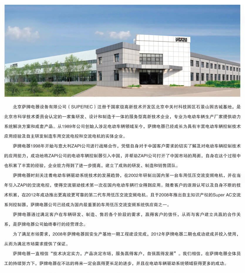 北京萨牌电器设备有限公司是意大利ZAPI公司在中国的独家代理,销售该公司的电动车辆控制器并提供售前和售后服务。 ZAPI公司是欧洲最大的电动车辆控制器供应商,为电动高尔夫球车、电动叉车和搬运车提供智能高频MOSFET控制器。