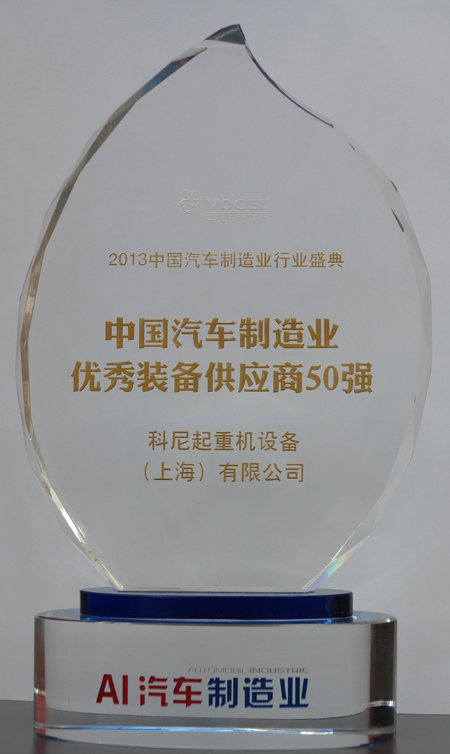 科尼中国被授予“中国汽车制造业优秀装备供应商50强 ”称号。科尼中国是起重机行业唯一一家被授予此称号的起重机设备供应商。