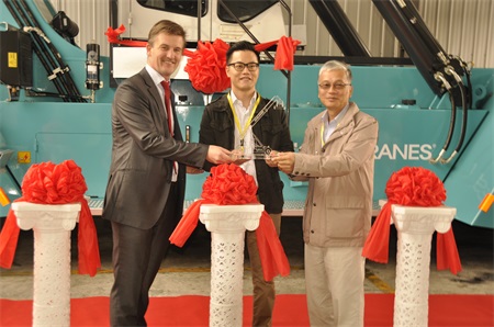 科尼叉车东北亚区销售及服务总监Trevor Morris将钥匙交付客户