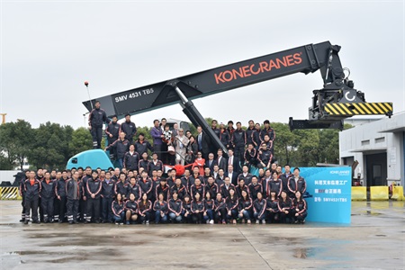 截至2015年11月19日,科尼港口机械(上海)有限公司正面吊累计生产总量达888台,为庆祝这一具有纪念意义的时刻,今天上午11:00,科尼叉车在其位于临港产业区芦潮港重装备产业配套园区工厂内,举行了简约而隆重的“科尼叉车临港工厂第888台正面吊”下线仪式。科尼叉车全球供应链总监Conny Persson、科尼叉车事业部临港工厂总经理Niklas Ruud、科尼叉车东北亚区销售及服务总监Trevor Morris、来自台湾的客户代表及科尼叉车全体员工百余人出席了下线仪式,共同见证了这一令人欢欣鼓舞的时刻。