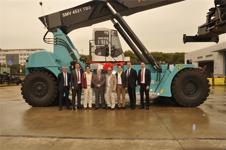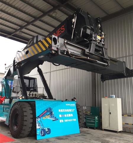 科尼第888台机器是型号为SMV4531 TB5的正面吊,由科尼叉车东北亚区销售及服务总监Trevor Morris将钥匙交付于台湾综富国际公司。这台正面吊是科尼公司最新一代集装箱正面吊,将提高企业现有租用场地的使用率。新技术的应用和结构的优化设计,使得该系列正面吊堪称当今世界最先进的正面吊之一。该系列正面吊配备了业界最为先进的整机电子控制系统,从发动机、减速箱、液压系统和吊具采集信号,经过中央处理器处理后,控制正面吊发动机、减速箱、液压系统和行车系统的运行,并使之处于最佳工作状况。灵活准确的操控性能,降低了司机的劳动强度。发动机采用了世界顶尖的斯堪尼亚产品,实现低油耗,高可靠性和出色的寿命期经济性。安全舒适的司机室,提供了宽阔清晰的视野。先进的网络布线,使整机电缆数量大为减少,故障率显著降低。