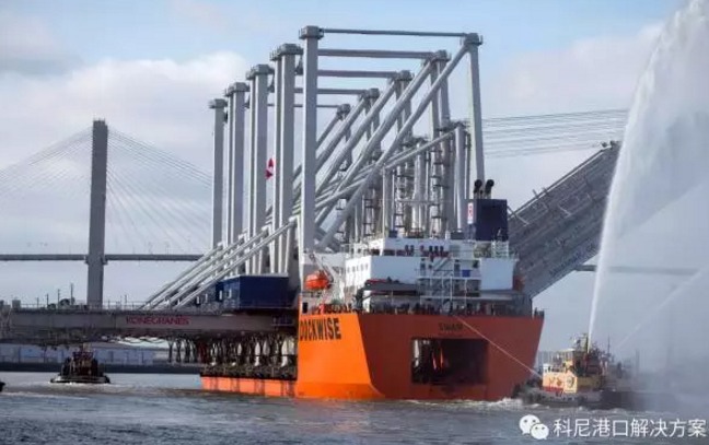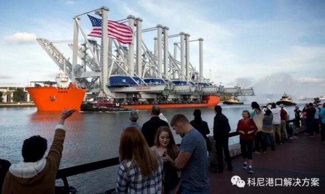 2017年11月22日清晨,萨凡纳河上的拖船驶向大海,迎接载着四台大型科尼岸桥的重吊船天鹅号。这些新巴拿马型起重机的高度足以提升码头上方152英尺的集装箱。每台岸桥的起重能力为72吨。目前前大梁端部距离码头表面192英尺。随着前大梁提升安装到最终位置并俯仰,岸桥将达到412英尺高。新的起重机将使萨凡纳的岸桥数量增加到30台。另外6台科尼岸桥将在2020年到达。当所有岸桥交付后,此次升级将使得美国最大的单一集装箱码头每小时装卸近1300个集装箱。