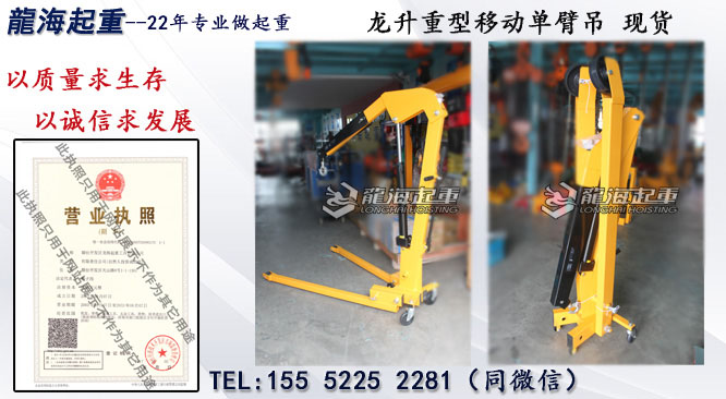 【公司承诺】:龙升移动单臂吊,我们是厂家直销,有现货、发货快不用等!22年生产经验,质量放心,每件产品出厂前均经过严格的质量检测合格,在正常使用情况下保质期内出现任何质量问题均免费调换!