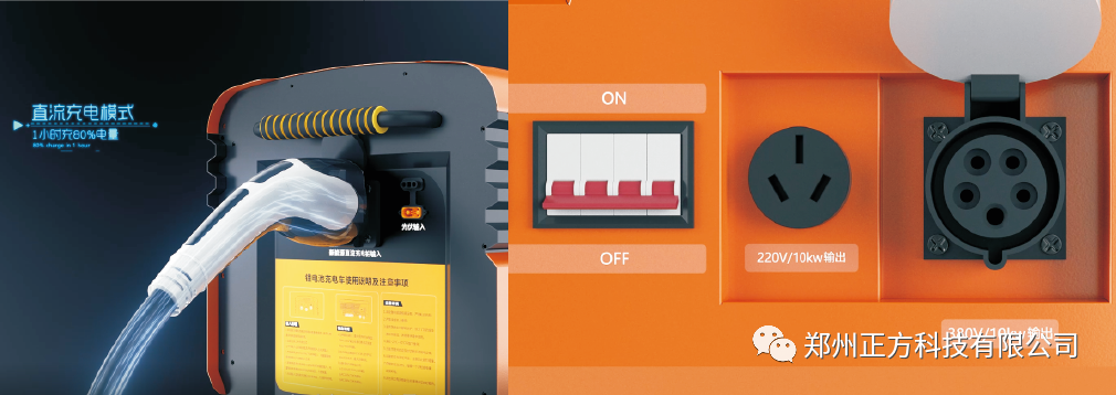 移动直流充电桩款:配备电动汽车标准九孔直流充电枪,给电动汽车快速充电应急。