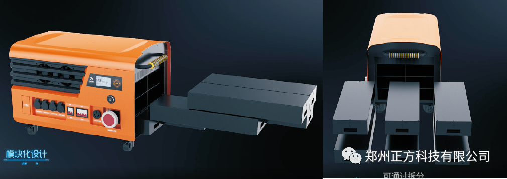整机尺寸为900mm*600mm*552mm,机身和电芯模块进行分离式设计,可以支持4组或5组灵活配置使用。分为1个机身,6个高能量密度电芯标准模块,内置有电子锁,工作状态下不可分离,保证设备运行状态下安全。电芯模块插拔方便,单个模块重28kg,机身重30kg,两个人可轻松搬运,解决了燃油发电机和常规移动大储能搬运不便的问题。