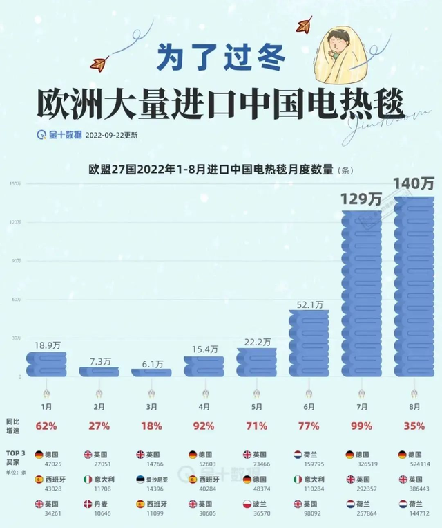 根据海关数据,今年1月,欧盟27国进口中国电热毯月度数量为18.9万条,6月增长至52.1万条,7月快速攀升至129万条,环比增长近150%。