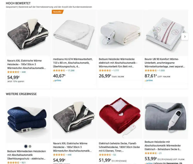 一条普通双人电热毯国内售价大约在200元人民币,而在亚马逊平台,最低可卖到40欧元(约合人民币279元)左右;贵点的也有100欧元(约合人民币699元)以上。