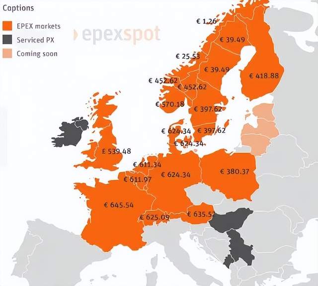 欧洲各国日前电力市场价格分布图 图片来自欧洲电力交易所(epex spot)