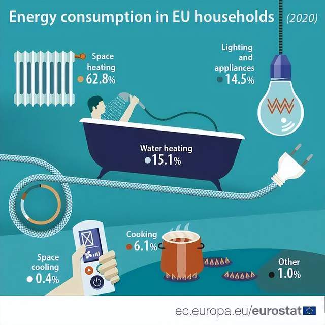按用途来看,取暖在欧盟家庭能源消费中的占比最大,高达62.8%;其次为生活用水,占15.1%;照明和电器仅占14.5%。