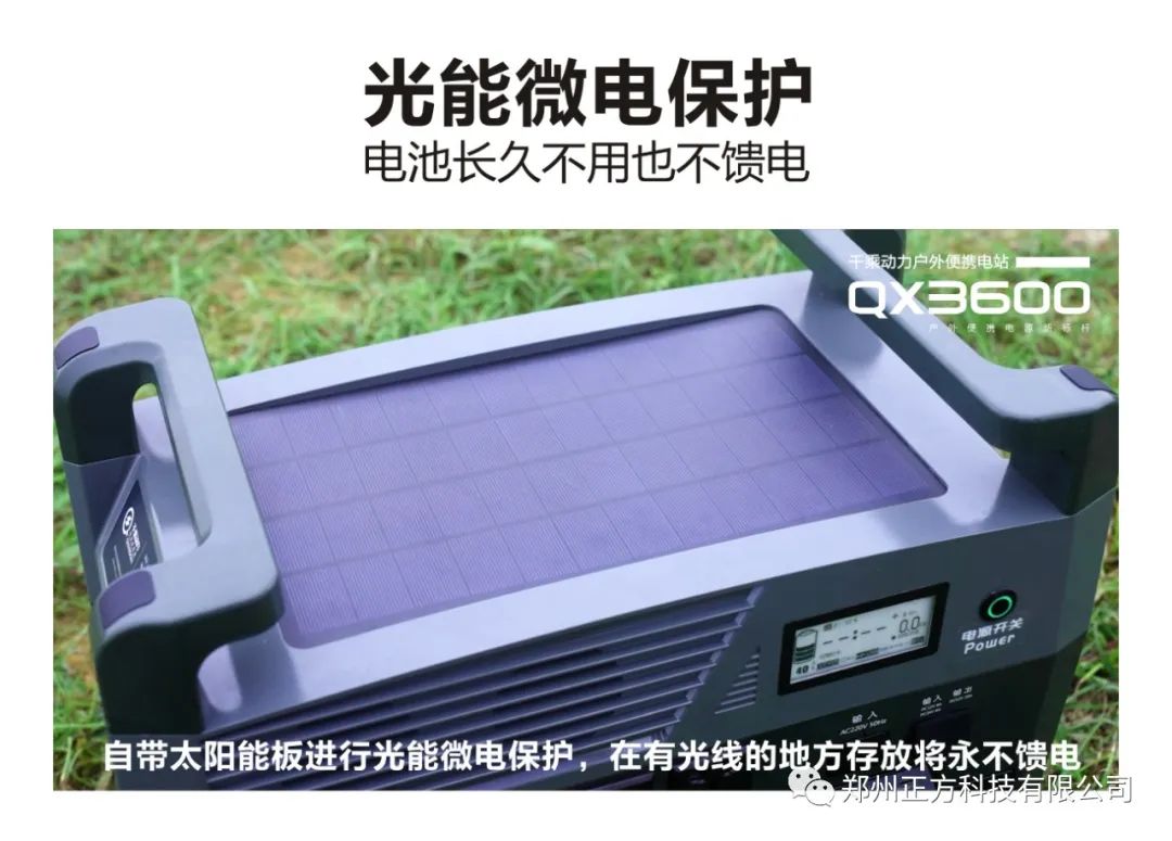 2.在不使用户外电源时,一般要求其安全储存电量应该保持在60-80%;但是方正科技推出的千乘动力QX3600自带太阳能板进行光能微电保护,只要在有光线的地方进行存放将永不亏电,长期不用也不至电池亏电损坏。