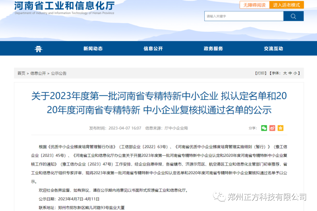 近日,从河南省工业和信息化厅传来消息,根据《优质中小企业梯度培育管理暂行办法》(工信部企业〔2022〕63号)、《河南省优质中小企业梯度培育管理实施细则(暂行)》(豫工信企业〔2023〕45号)、《河南省工业和信息化厅办公室关于开展2023年度第一批河南省专精特新中小企业认定和2020年度河南省专精特新中小企业复核工作的通知》(豫工信办企业〔2023〕47号)工作安排,经企业自愿申报,各省辖市、济源示范区、航空港区工业和信息化主管部门初审推荐,省工业和信息化厅组织专家评审,2023年度第一批河南省专精特新中小企业拟认定名单和2020年度河南省专精特新中小企业复核拟通过名单已经出炉,其中就包括新能源领域的科技型研发创新公司—正方科技。
