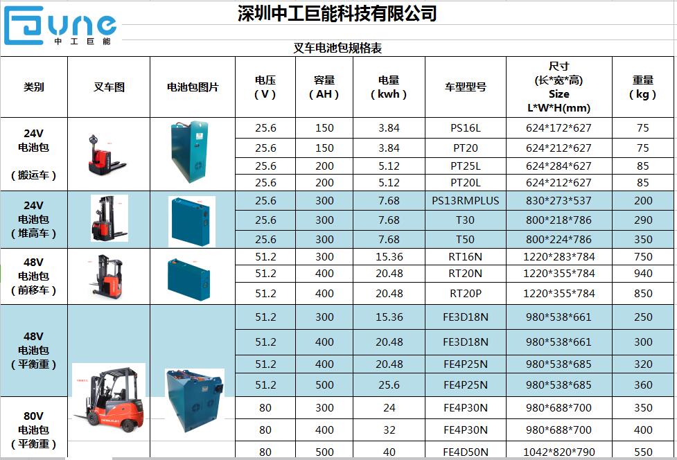中工巨能叉车锂电池包规格表