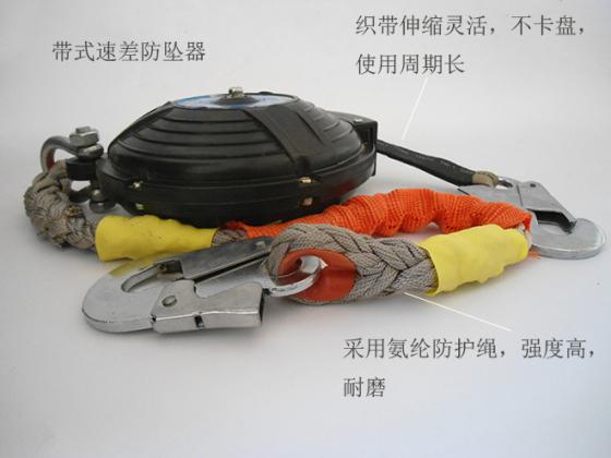 带式速差防坠器采用采用耐磨织带作为承重绳,不但质量轻,无负坠感,而且不会卡盘,伸缩性好。采用双锁止系统,锁止平衡稳定。吊环经镀锌处理,防锈蚀性能高,应用工业注塑外壳,耐磨,绝缘。