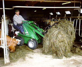 从这个角度来看,第一台 Avant 诞生了:滑移装载机,配备 11 马力的汽油发动机,能够在 10-15 分钟内将饲料分配给 50-80 头奶牛,一天两次,一年 365 天。以前用独轮车和铲子完成的任务。