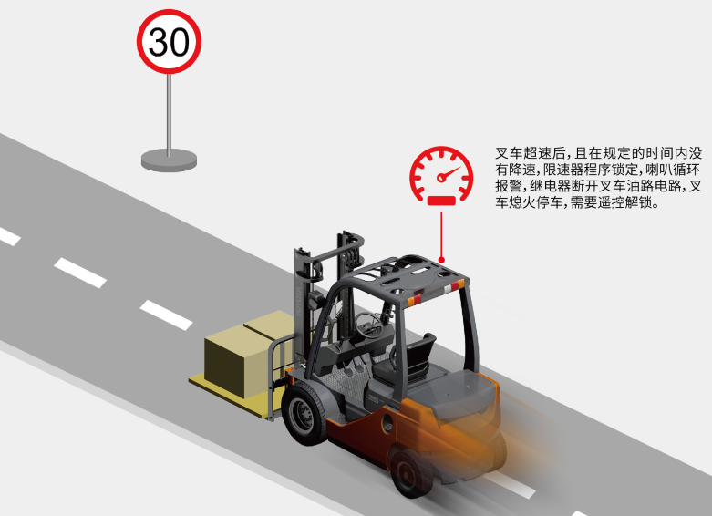 叉车限速器主要功能是超速三级报警、倒车提醒、强制限速管理等等。叉车限速器可预设3级速度,当叉车司机在行驶过程中超速时,叉车限速器会进行相应的警报提醒。如设置一级速度为8km/h,二级速度为10km/h,三级速度为12km/h。那么叉车行驶速度为8km/h时警示灯闪烁提醒;叉车行驶速度为10km/h警示灯闪烁、喇叭报警;叉车行驶速度为12km/h警示灯闪烁、喇叭真人语音报警,若司机未降速,叉车限速器会锁定报警并强制执行限速功能,只有管理员才能解锁。