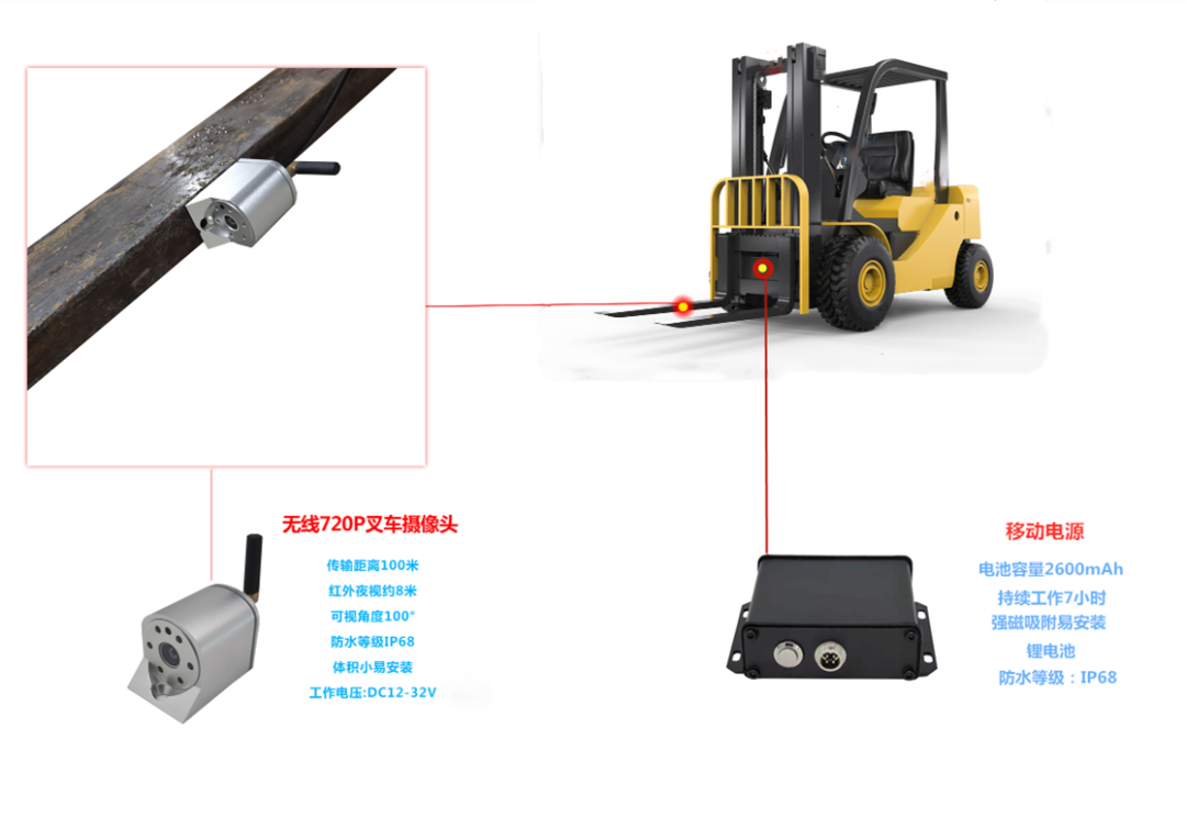 1、功能项 带行车记录功能,最大支持128G储存空间,可以记录叉车工作内容,防止事故存在争议。 2、安装简便 无线摄像头,小巧,强磁吸附;只需要找准位置固定即可,告别传统的摄像头需要接电源线的情况,不用担心升降绞线