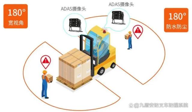在车辆护顶架前后方,安装两颗具备不光设计的超广角摄像头(角度达180°)让叉车重点监控区域全覆盖,在光线不佳的环境也能够提供人员侦测。