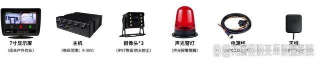 组成:显示屏+主机+3个摄像头+喇叭+ACC信号电源线+GPS/北斗天线