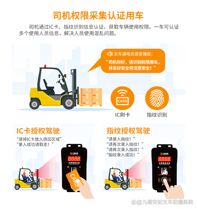 确保叉车驾驶员的身份真实可靠。这一功能要求驾驶员在启动叉车前,必须通过IC卡及指纹的双重验证。这样做不仅能有效防止非授权人员操作叉车,还能在发生问题时迅速追踪到责任人,极大地提高了叉车使用的安全性。通过这一系统的实施,可以有效减少工作场所事故的发生,提高工作效率,同时也降低了安全事故的发生率。