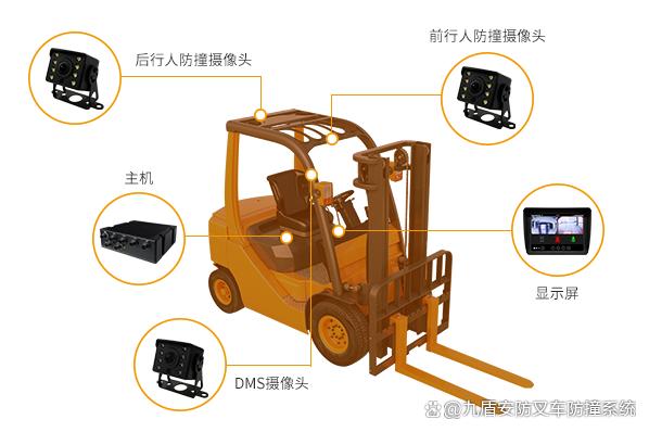 九盾叉车AI行车防撞监控系统安装在叉车驾驶室顶的前后单独安装ADAS摄像头,结合深度学习算法以完成机器视觉的识别工作,分别安装在车辆护顶架前后方,进行180°二级区域视频监控,同时解决二个方向维度的视野盲区,可根据距离车辆的不同距离,增加行人监测主动画面和声音预警。