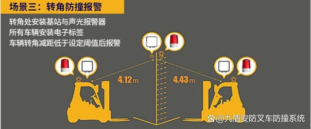 2.拐角处:在工厂或仓库环境中,拐角处通常存在较大的盲区,视线遮挡严重,难以看到周边的状况。在拐角处安装UWB防撞系统配套的声光报警灯,通过设定报警距离和提醒方式,达到拐角盲区防撞的目的。