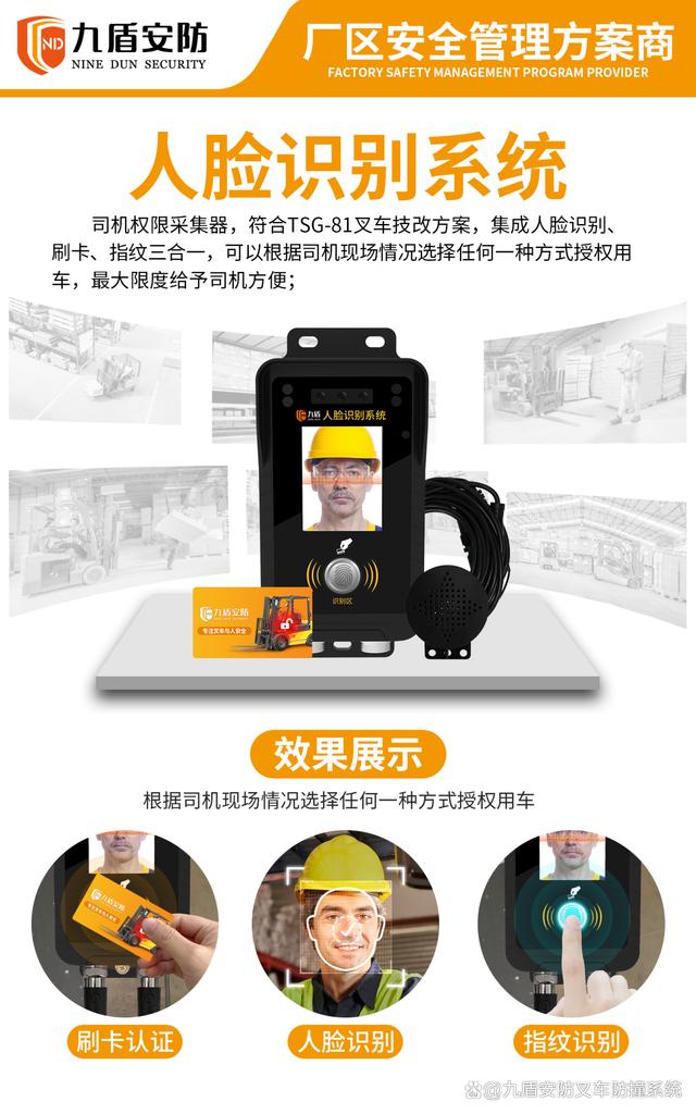 而九盾安防所研发的叉车司机权限采集器,更是集人脸识别、刷卡、指纹三合一的集大成者。它灵活多变,可根据司机的实际情况选择最合适的授权方式,最大限度地为司机提供了便利。