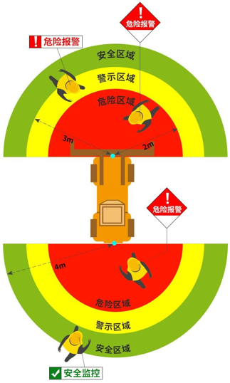 针对行人安全,该系统通过声音和视觉信号为叉车操作员提供及时的警报,行人不需要佩戴电子标签。此外,该系统还允许用户根据实际需求设置个性化的报警距离,以在效率和安全之间找到最佳平衡。