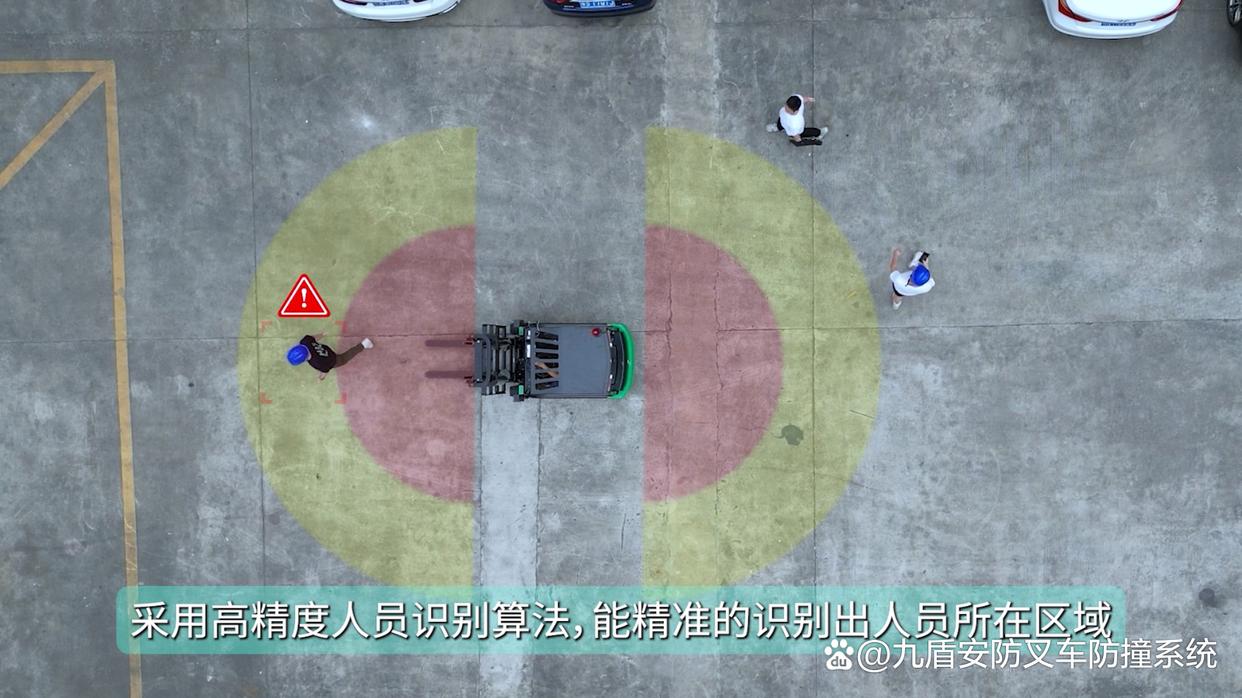 【九盾方案】搭载人员主动防撞技术,可通过智能AI摄像头识别动态行人,当黄色警示区、红色危险区出现行人时,分别进行减速和刹车的车辆主动控制,从而提升叉车本质安全。