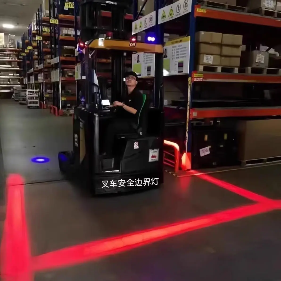 为解决路段照明不佳的问题,工程团队开发了区域警示灯。采用LED灯珠、与高亮度投射技术,可在叉车周围形成清晰可见的警示光带,有效提升夜间或低照度环境下的作业安全性。当叉车启动时,警示灯自动亮起,投射出红色或蓝色光区,提醒周边人员保持安全距离。
