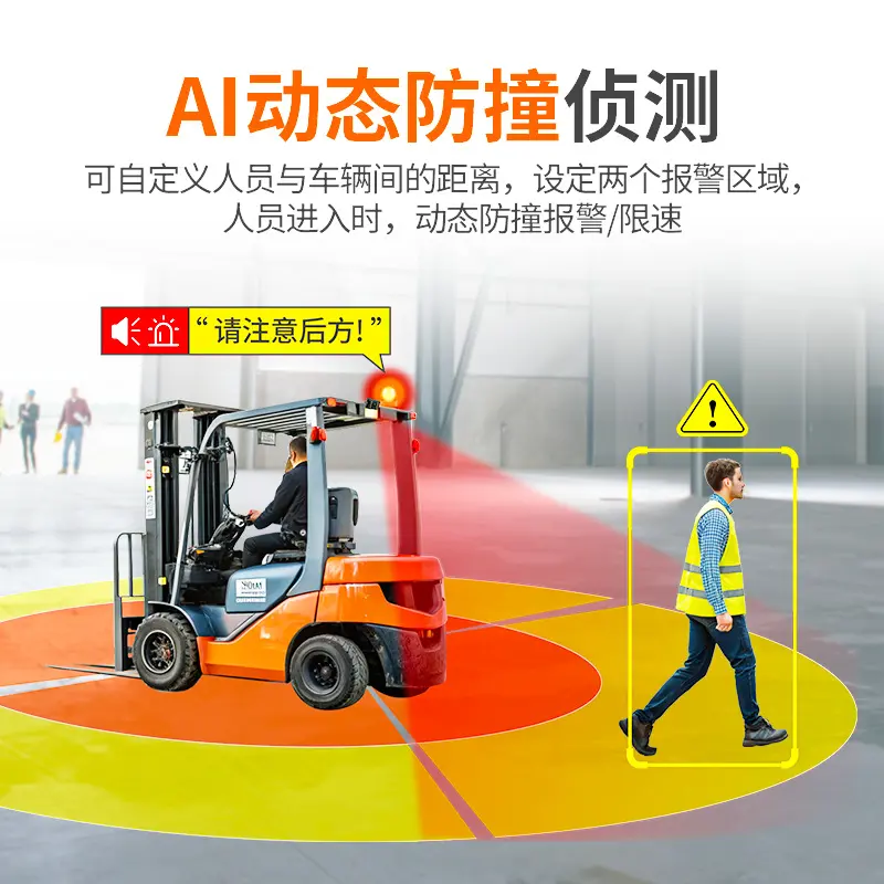 叉车AI智能防撞预警系统是九盾安防针对汽配厂特殊工况研发的主动防护方案。该系统采用AI人工智能技术,可实现一个摄像头190度监测(支持前后左右):当检测到5米内出现人员时,立即触发三级预警机制——先通过驾驶室显示屏警示,再发出语音提醒,最后自动限制车速至安全阈值,可选配强制限速或主动刹车。